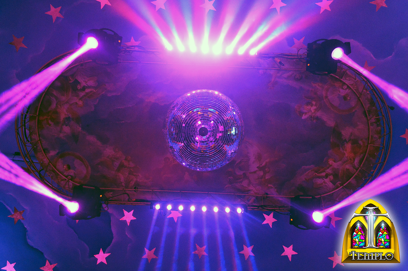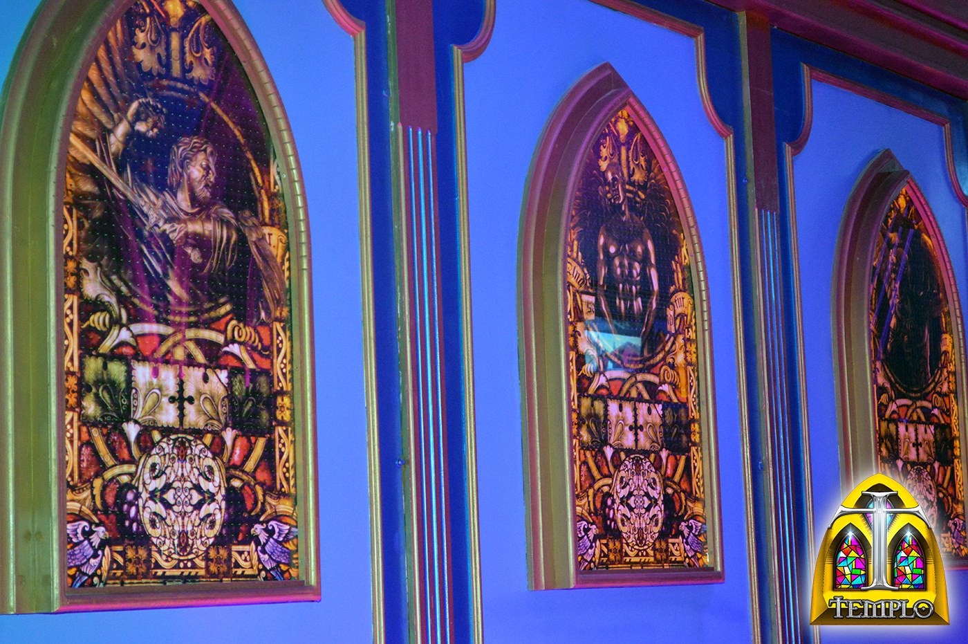 Cuando subí la mirada vi que el techo estaba pintado a mano, tiene una cúpula forrada de hojilla de oro con estrellas pintada en ellas, en las paredes encuentras imitaciones de vitrales con escenas de cuadros religiosos famosos pero alusivos al ambiente del lugar, uno de los vitrales muestra una imitación de “La Tentación”, como exaltando la invitación al pecado y al placer. Una imagen del Ángel de la Victoria corona la sensación de estar en un lugar de culto profanando sus más profundas construcciones de la moral. Las luces fluorescentes, en rosas, azules y morados resaltan aún más el carácter sacrílego que tiene el Templo.